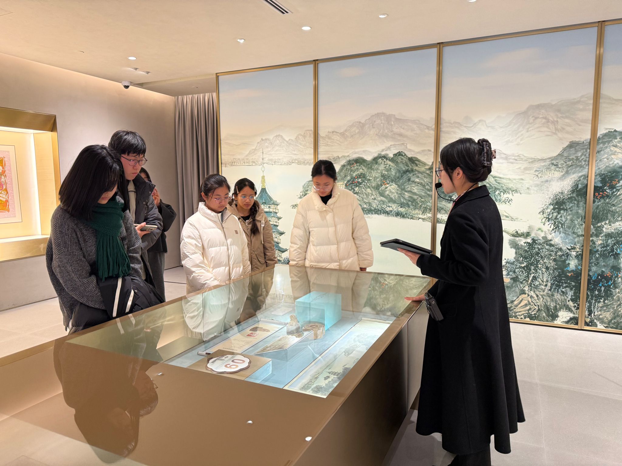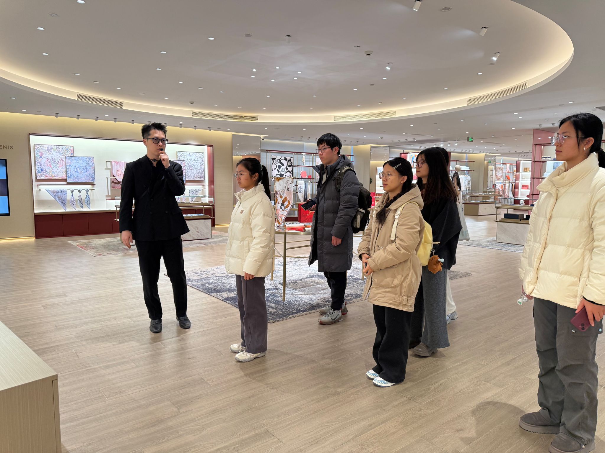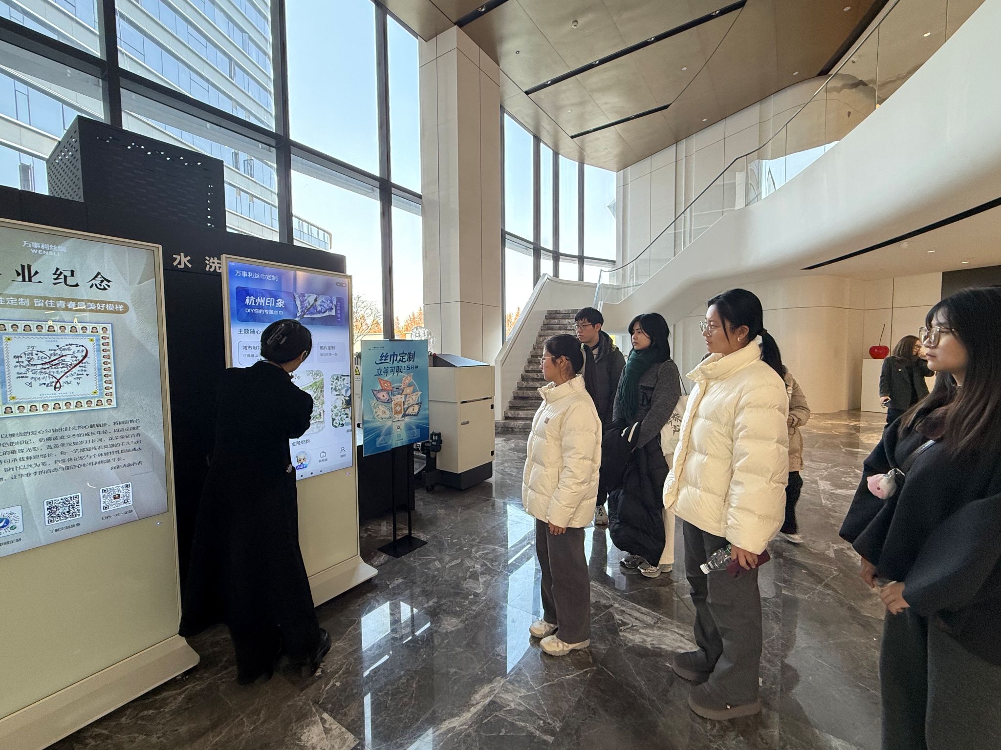 在企业接待人员的引导下,师生们首先走进万事利丝绸艺术馆。馆内展品丰富多元,从承载千年礼制文化的圣旨、官服,到依托科技复刻的45.5克素纱单衣、孔雀羽毛雀金裘,再到彰显国潮风范的G20峰会同款丝巾、故宫联名文创产品,全方位展现了丝绸文化的千年底蕴与当代创新活力。师生们近距离观摩展品,深入了解传统丝绸工艺与现代科技融合的发展历程,对“文化为根、科技为翼”的企业发展理念有了深刻认知,也为后续精准对接企业人才需求奠定了基础。